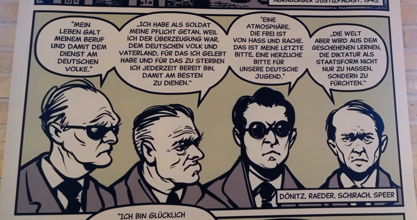 Dass die Kriegsverbrecher weder Einsicht noch Reue zeigten, zeigen auch die Sprechblasen im Comic hervor, von dem die Ausstellung Bilder zeigt. Hitlers Stararchitekt Albert Speer war bei seinen Mitgefangenen unbeliebt, weil er in Nürnberg im Gegensatz zu den anderen Angeklagten so etwas wie Mitverantwortung an Naziverbrechen und Untergang des „Dritten Reichs“ eingeräumt hatte.