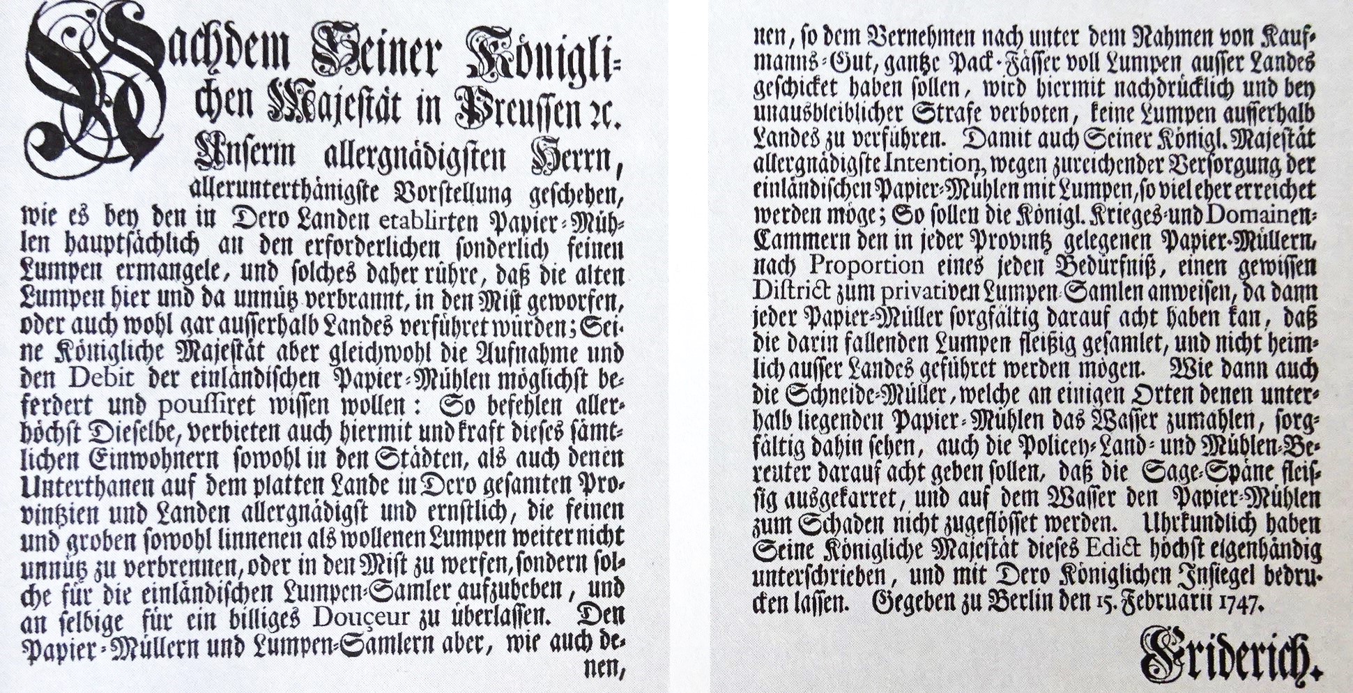 Die typisch preußische Regelwut äußerte sich in einer Flut von Edikten und Gesetzen. Hier geht es um das Sammeln von Lumpen und Papier, mit dem man die Einfuhr teurer Rohstoffe vermeiden wollte.