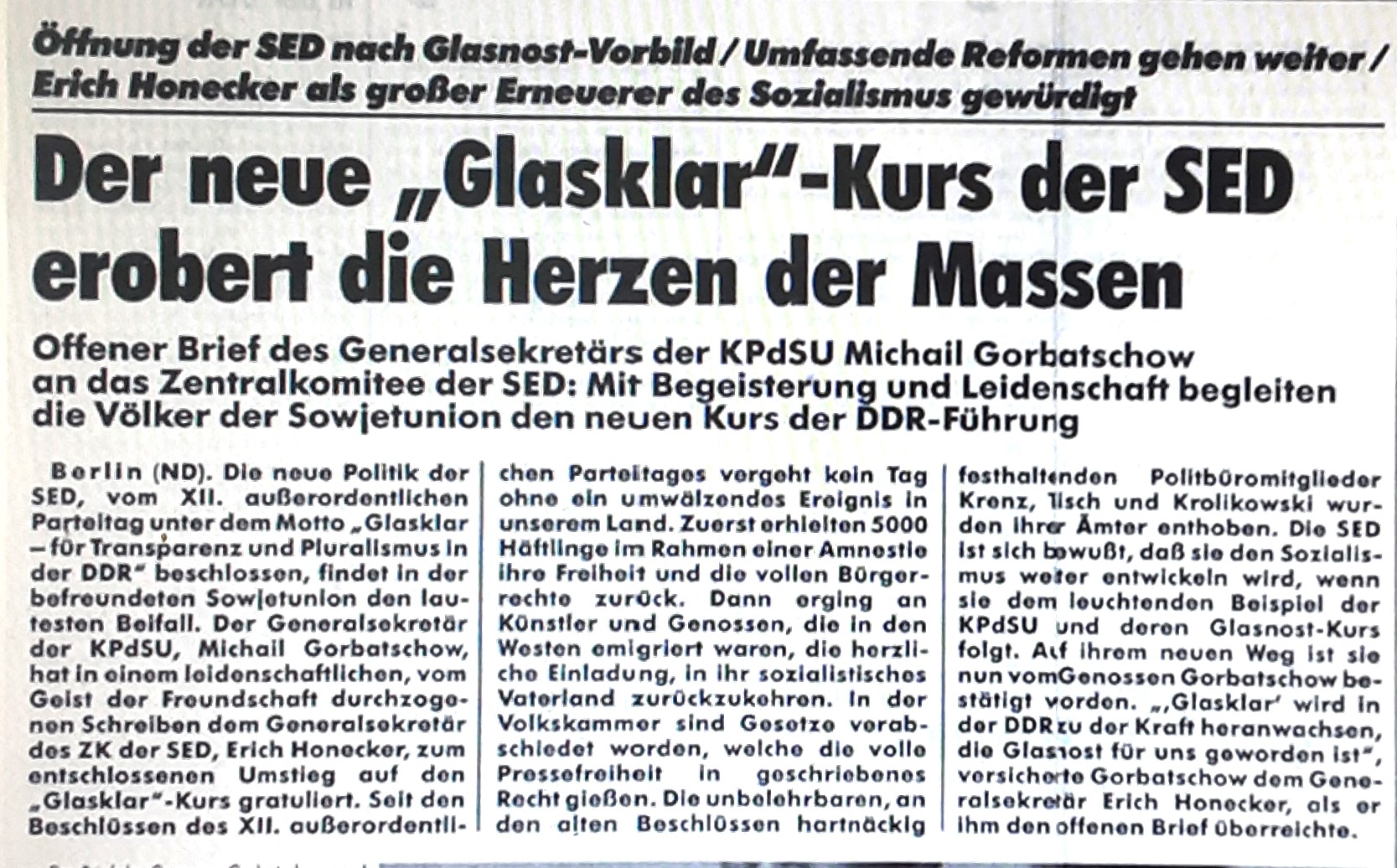 Behauptet wird auf Seite 1 des Fake-ND vom März 1988, dass die SED unter Honeckers Führung nach Moskauer Vorbild mit dem Glasklar-Kurs die „Herzen der Massen“ erobern will. In einem fiktiven Interview sagt der Partei- und Staatschef, er werde für einen „liebenswerten Sozialismus“ sorgen. Die Spezialausgabe des ND wird in dem Buch von Burghard Ciesla und Dirk Külow „Zwischen den Zeilen – Geschichte der Zeitung ,Neues Deutschland'“ (Verlag Das Neue Berlin 2009; 256 Seiten, zahlr. Abb., 24,90 Euro, ISBN 978-3-360-01920-2) im Zusammenhang mit dem Besuch von Honecker im März 1987 in der Bundesrepublik Deutschland erwähnt. Die Autoren schildern, wie verheerend sich die ständigen Eingriffe der Parteichefs Ulbricht und Honecker und ihrer Handlanger im SED-Zentralkomitee und Presseamt der DDR auf die Arbeit der Redaktion und das Betriebsklima ausgewirkt haben. 1946 gegründet, erreichte das ND als Sprachrohr des Zentralkomitees der Sozialistischen Einheitspartei täglich eine Auflage bis zwei Millionen Exemplare. 35 Jahre nach dem Ende der DDR findet das deutlich geschrumpfte Nachfolgeblatt „ND der Tag“ im linken Spektrum seine Leser.