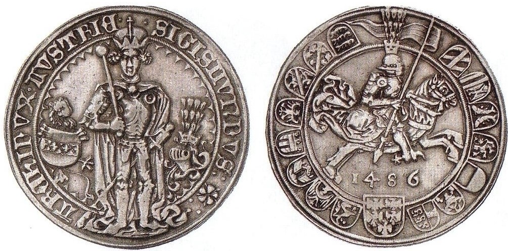 Mit der Emission des ungewöhnlich großen und schweren Guldengroschen als Äquivalent des Goldgulden (oben) begann in Tirol ein neuer Abschnitt in der europäischen und internationalen Münz- und Geldgeschichte. Der Guldengroschen stammt aus dem Jahr 1486, das Halbstück trägt die Jahreszahl 1484.