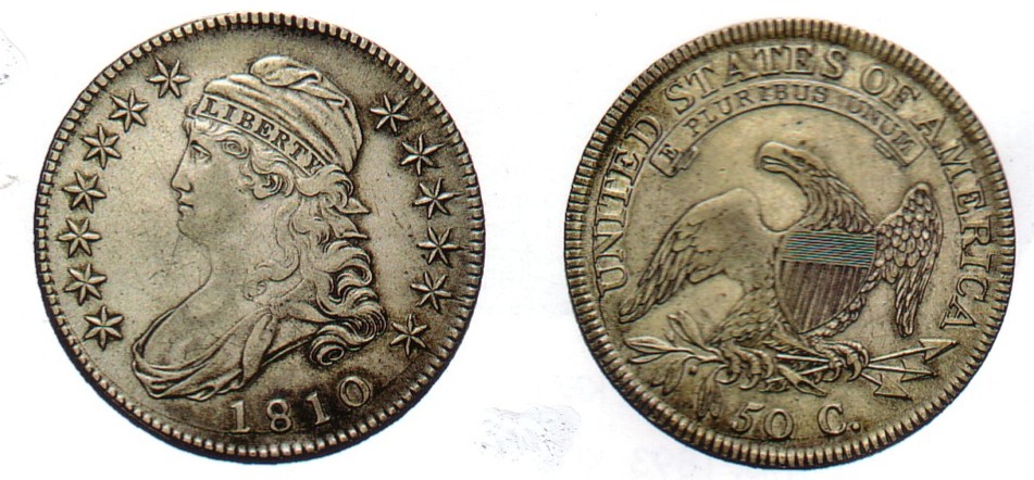 Auch die Münzen der Vereinigten Staaten von Amerika weisen ähnliche Merkmale auf, hier gut zu sehen auf einem halben Dollar von 1810.