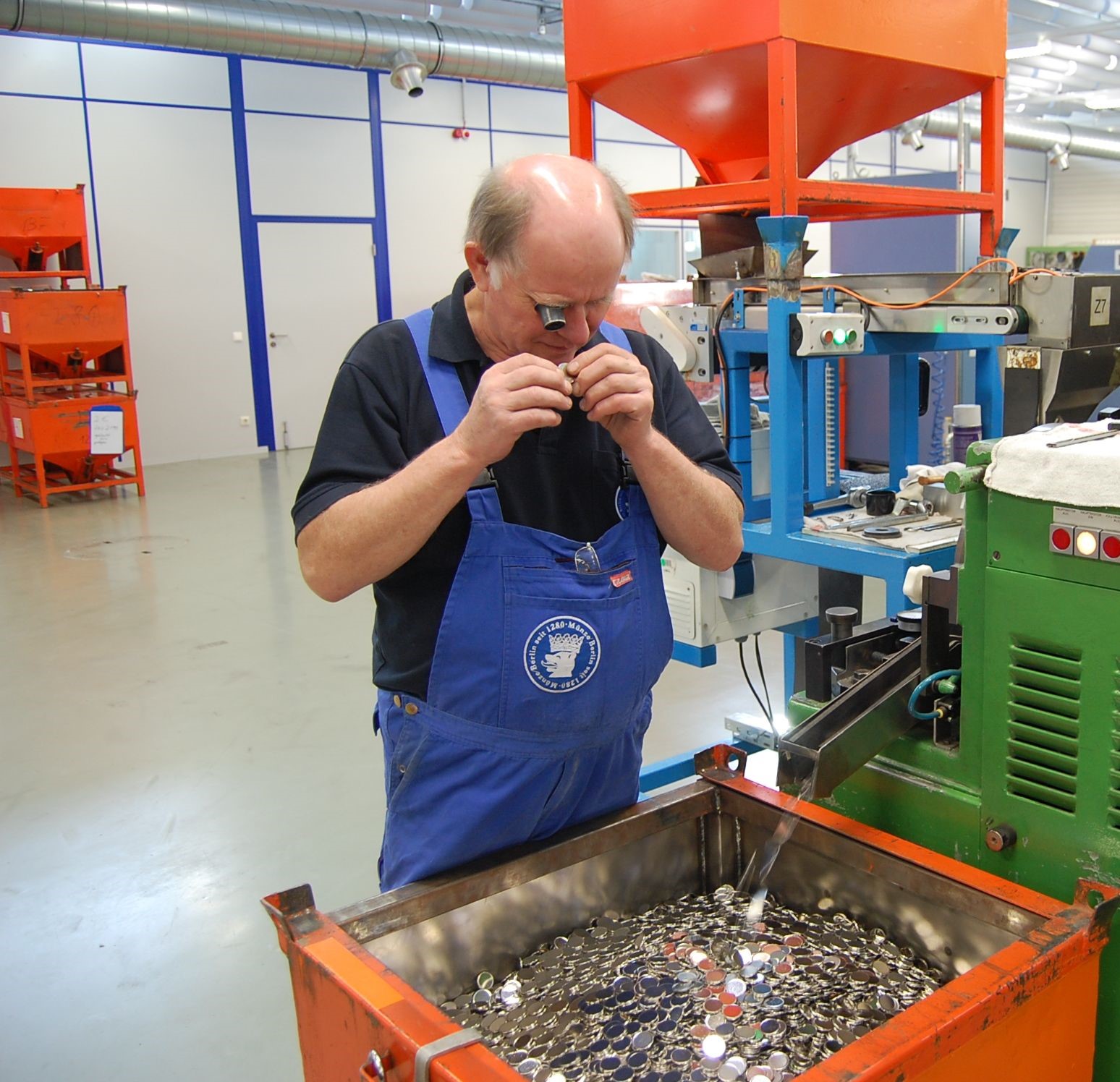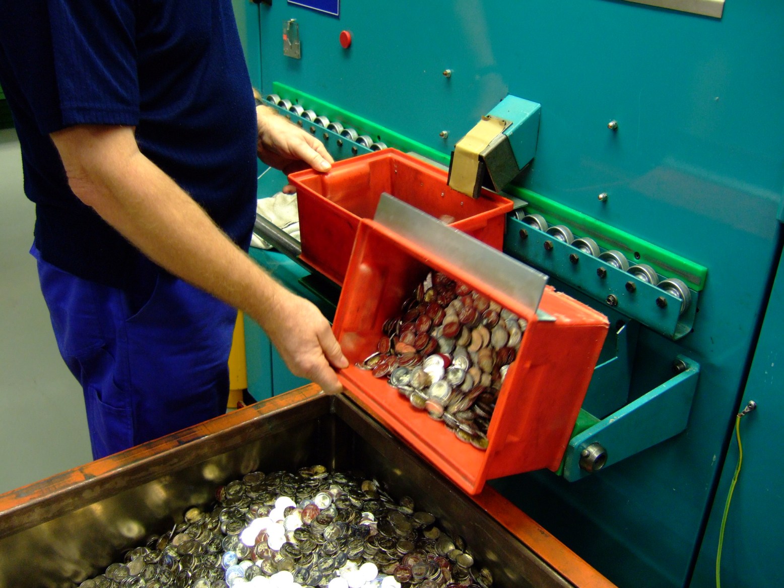 In der Staatlichen Münze Berlin fließen frisch geprägte Euromünzen in rote Metallkisten. Vor hier aus geht es zu den Zählmaschinen und Verpackungsanlagen. Die In verplombten Säcken verstauten Geldmengen werden an die Bundesbank und vor dort in Umlauf gegeben. Ständige Kontrolle der blitzblanken Geldstücke ist Pflicht, ebenso werden in einem bestimmten Turnus abgenutzte Stempel durch neue ersetzt.