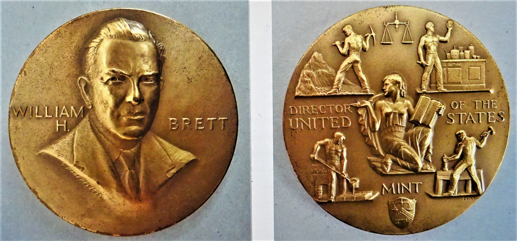 G. Roberts schuf 1954 diese Medaille zum Amtsantritt von William H. Brett als Direktor der mit Geldfabriken über das ganze Land verteilten US-Mint. Auch diese Medaille aus Messing hat einen Durchmesser von75 mm und wiegt 211 g.