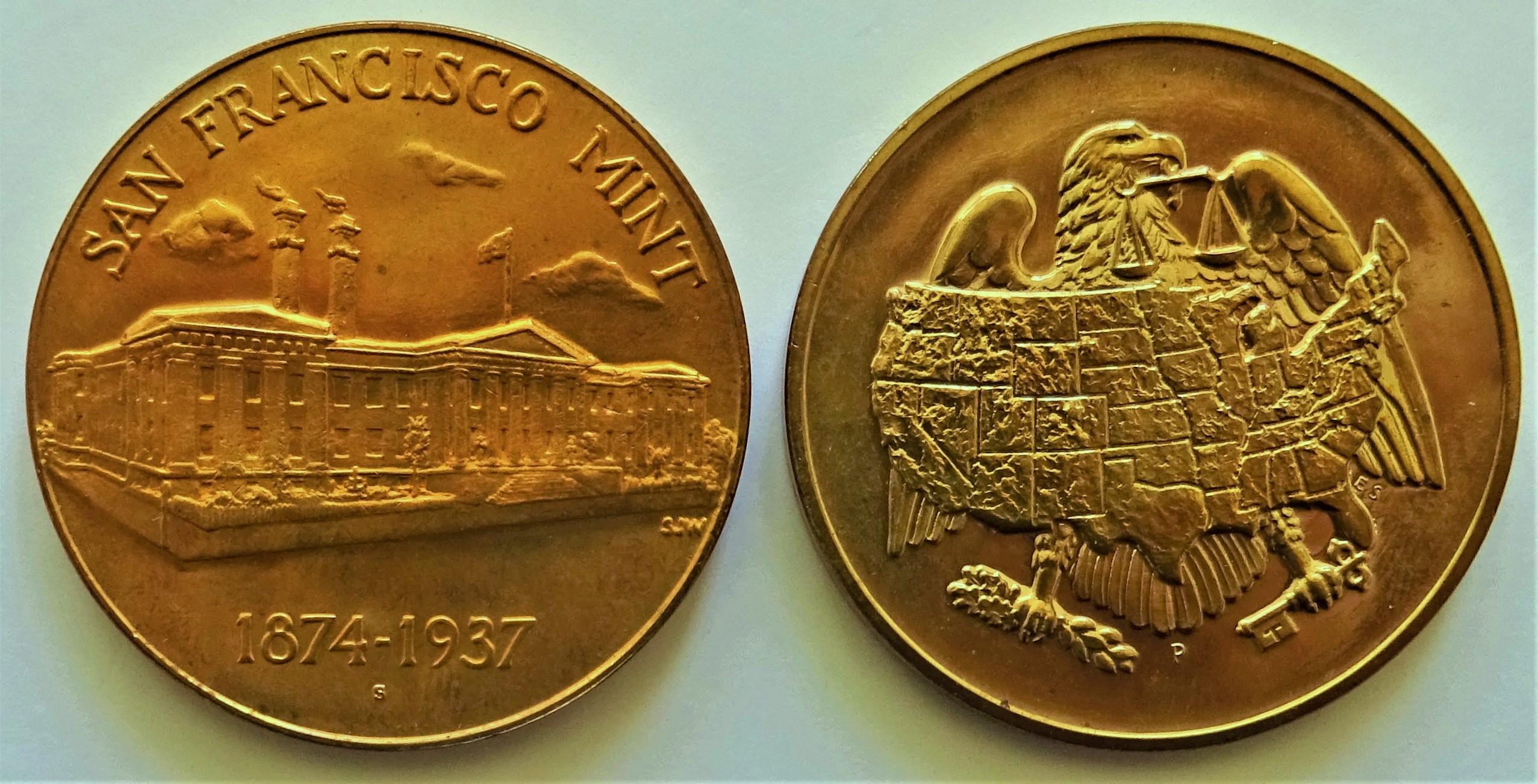Die US-Mint stellt auf ihren Medaillen einzelne Produktionsstätten wie die Geldfabrik in San Francisco in Kombination vor. Der Wappenadler hält eine Waage und einen Tresorschlüssel.