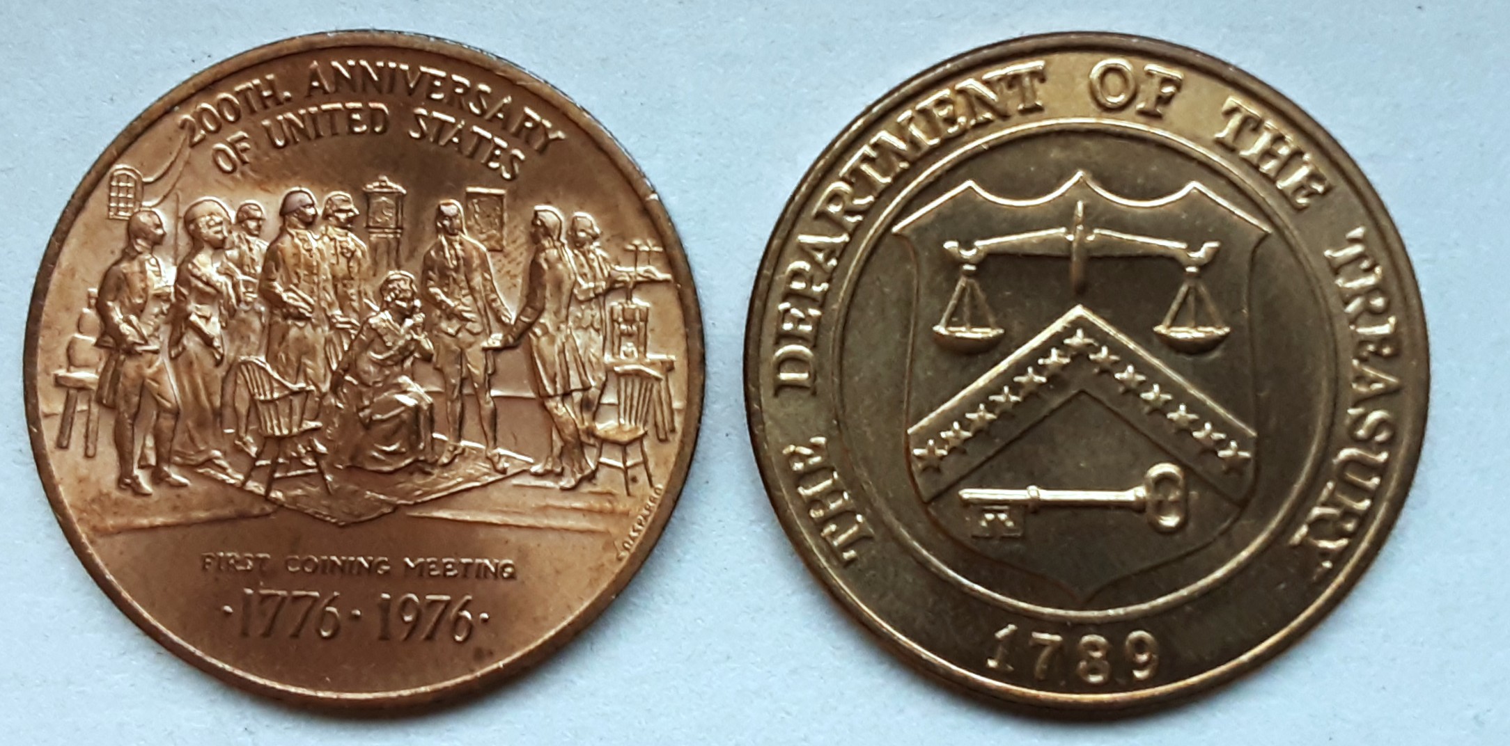 Die Erringung ihrer Unabhängigkeit 1776 feiert diese Medaille von 1976. Sie zeigt, wie Martha Washington und ihr Mann, Präsident George Washington, in der Münze von Philadelphia frisch geprägtes Geld der anschauen. Das Motiv ist einem Gemälde des Historienmalers John Ward Dunsmore nachempfunden.
