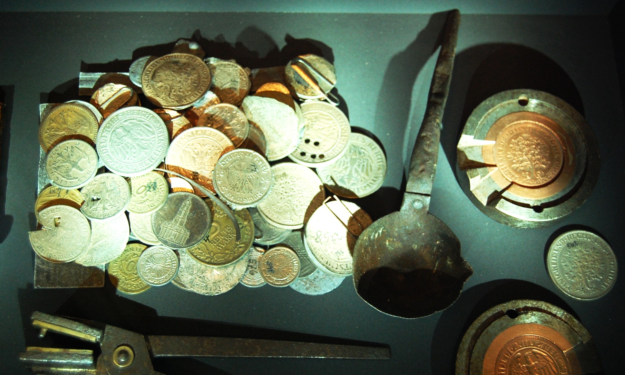 Aus der Zeit der Weimarer Republik stammen diese in der Fälschungsausstellung des Münzkabinetts im Bode-Museum ausgestellten Gussformen.