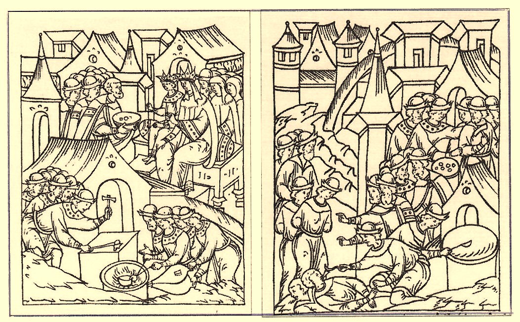 Wer als Münzfälscher erwischt wurde, war in alten Zeiten unweigerlich des Todes, bestenfalls hat man ihm die Hand abgeschlagen. Die russische Miniatur zeigt rechts, wie einem gefesselten Fälscher flüssiges Metall in den Hals gegossen wird.