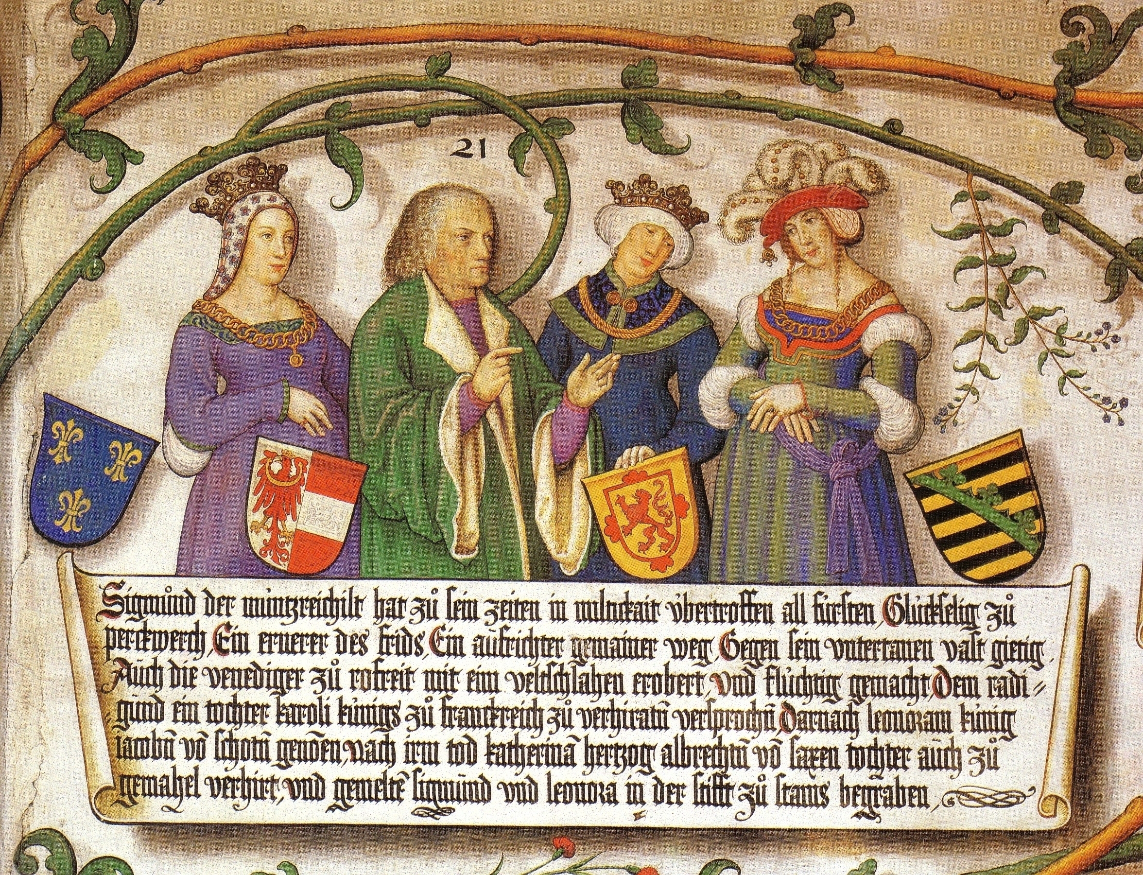Die farbige Miniatur lobt Sigmund „über den grünen Klee“ und zeigt ihn mit seinen aus Schottland und Sachsen stammenden Gemahlinnen.