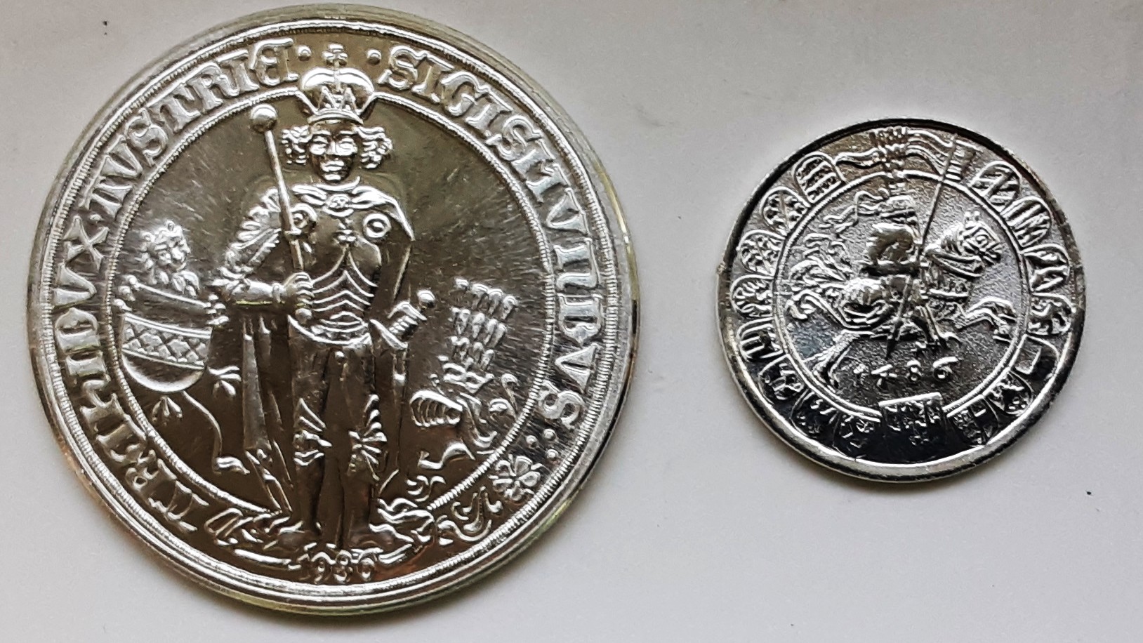 Von persönlichen und politischen Krisen und Katastrophen im Leben des Tiroler Erzherzogs, die auch im Museum Burg Hasegg nicht ausgespart werden, ist auf den Münzen nichts zu sehen. Sie zeigen den stolzen Landesherrn stehend in voller Rüstung oder auch sein Brustbild mit einer gezackten Krone, dazu Wappenschilder als Symbole für die Gebiete, die er sein eigen nannte oder auf die er Ansprüche erhob. Dass über ein Jahrhundert später die aus dem Haus Habsburg kommenden Hoch- und Deutschmeister auf ihren Münzen Motive aus Sigmunds Zeiten neu verwendet haben, ist ein ungewöhnlicher Vorgang, denn sie waren bereits überholt.