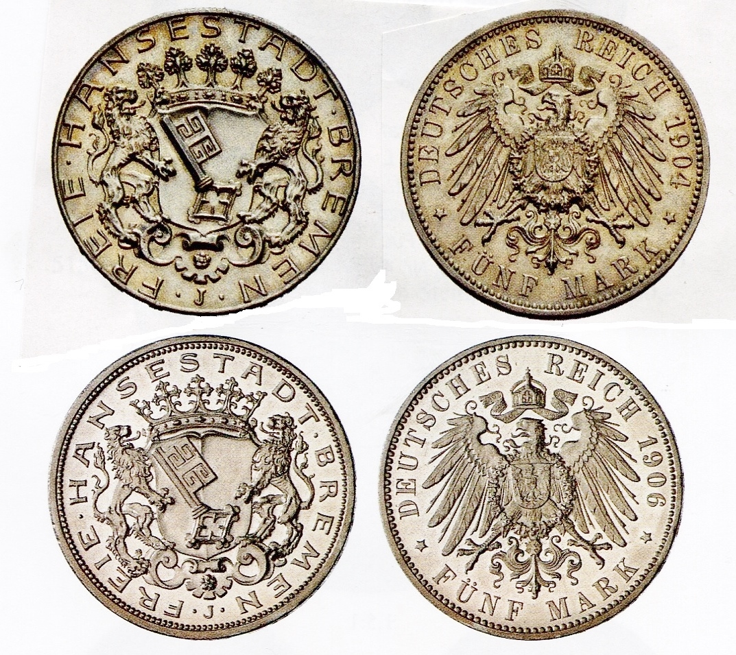 Die Ausgabe des Bremer Fünf-Mark-Stücks von 1904 ohne Perlkreis ist selten und sehr teuer, 1906 kam die reguläre Münze heraus.