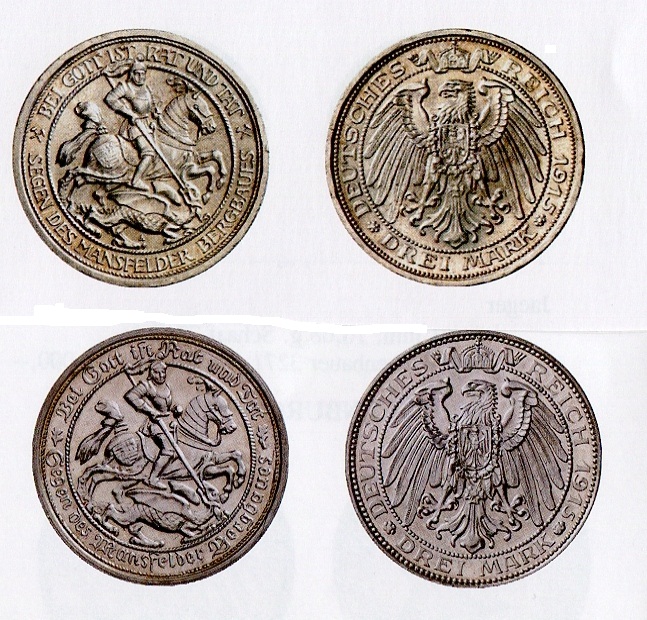Von der bekannten Drei-Mark-Münze von 1915 auf die Zugehörigkeit der Grafschaft Mansfeld zu Preußen gibt es eine sehr teure Probe mit Frakturschrift.
