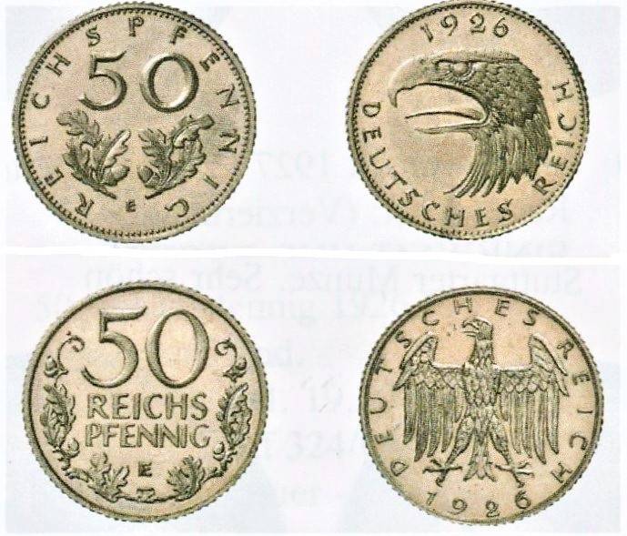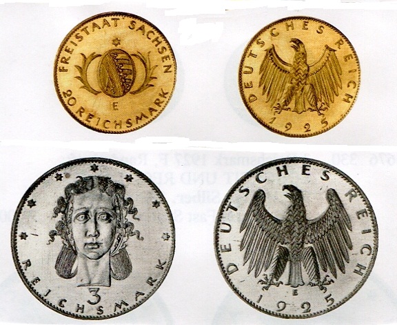 Die Goldmünzen der Weimarer Republik wurden nur probeweise geprägt und sind daher extrem selten und teuer. Mit Germania-Köpfen taten sich damalige Künstler schwer. Alle dem Reichskunstwart vorgelegten Proben und Modelle blieben auf der Strecke.