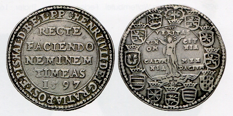 Unter den in Eisleben entdeckten Talern befinden sich einer des sächsischen Kurfürsten August von 1564 und ein weiterer des Herzogs Heinrich Julius von Braunschweig-Wolfenbüttel von 1597. Der so genannte Wahrheitstaler mahnt in lateinischer Sprache “Tue Recht und scheue niemand” und ist Teil einer Serie, mit der der Landesherr Stimmung gegen adlige Familien machte, die sich nicht seinem Willen beugen wollten. Die Symbolfigur der Veritas (Wahrheit) triumphiert auf der Rückseite über Lüge und Verleumdung.