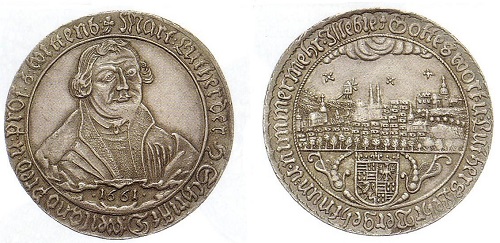 Eisleben setzte seinem großen Sohn Martin Luther 1661 mit diesem Taler ein schönes Denkmal. Zum Porträt des 1483 hier geborenen und 1546 auch gestorbenen Reformators passt die Stadtansicht, die von den Türmen der St. Andreaskirche überragt wird.