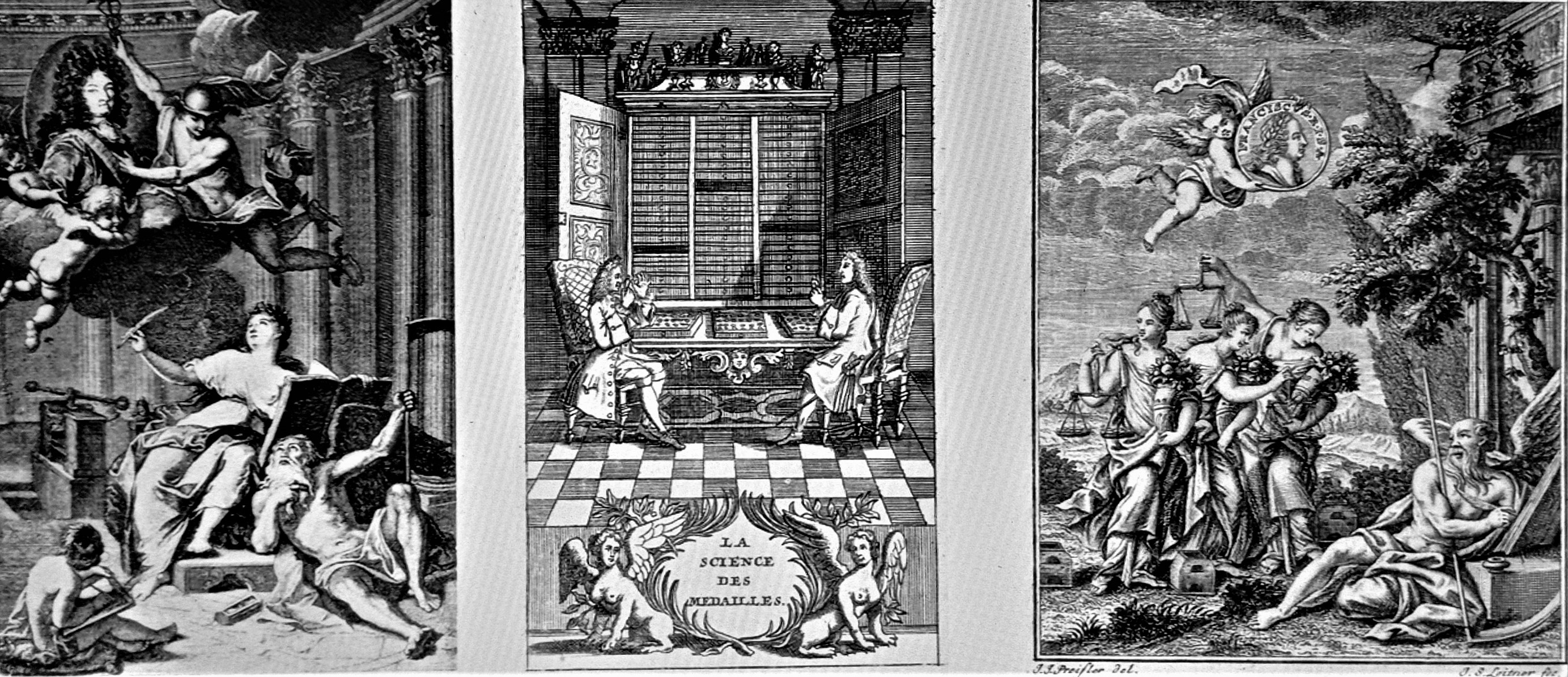 Das Münzensammeln war vor 300 Jahren und lange danach eine edle und kostspielige Sache. Händler beschafften Raritäten aller Art, und das funktionierte noch ohne Telefon, e-Mail und Internet. Die Stiche feiern das Münzensammeln mit typisch barockem Allegorienprunk.