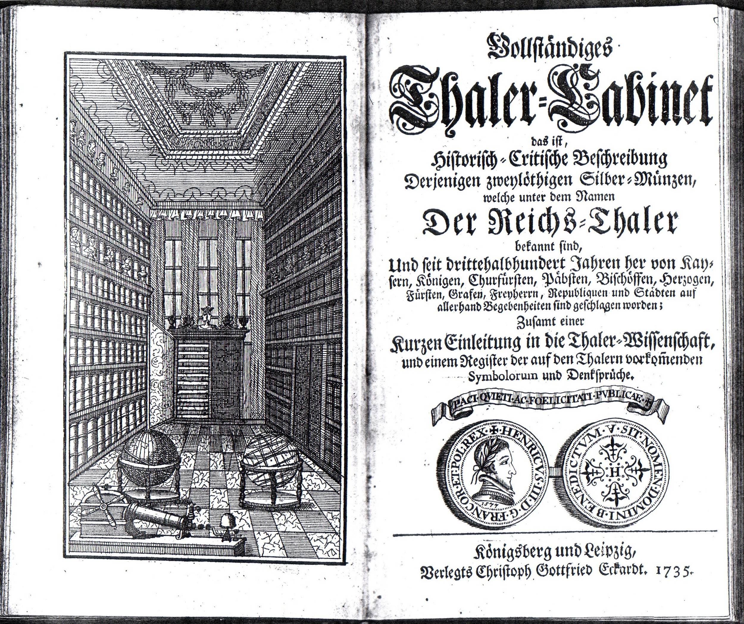 Eines dieser Bücher wurde von dem Pfarrer Lilienthal verfasst und trägt den barock-langatmigen Titel „Vollständiges Thaler-Cabinet das ist Historisch-critische Beschreibung derjenigen zweylöthigen Silber-Münzen, welche unter dem Namen Der Reichs-Thaler bekannt sind“. Der Band hat in der dritten Auflage von 1735 nicht weniger als 450 Seiten und dazu noch drei Register. Erfasst sind über 1500 Taler und talerförmige Münzen. Aus Kostengründen hat man auf Kupferstich-Abbildungen verzichtet. Die Aufzählung beginnt bei den Geprägen der römisch-deutschen Kaiser und der russischen Zaren, geht über zu den Münzen aus den Königreichen Frankreich, England, Schweden, Ungarn, Böhmen, Dänemark, Polen und Preußen. Der Katalog erfasst ferner die Taler der deutschen Kurfürsten, gefolgt von den geistlichen Fürsten mit dem Papst an der Spitze. Mit den Silbermünzen der Fürsten, Markgrafen, Pfalzgrafen und anderen Standesherren sowie mit städtischen Ausgaben schließt das Nachschlagewerk ab. So gut es geht, wird jedes Stück beschrieben, und so ist es mit einiger Mühe möglich, bestimmte Objekte zu identifizieren.