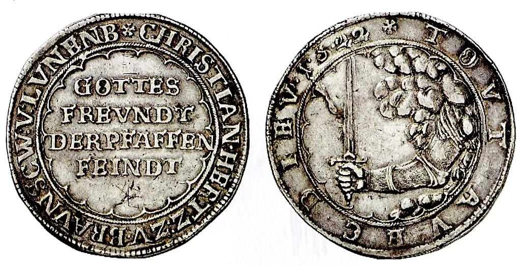Die braunschweigische Pfaffenfeindtaler von 1622 und die Krone mit dem Bildnis des englischen Lordprotektors Oliver Cromwell von 1655, bei dem der Stempelriss am Hals als Hinweis auf sein baldiges Ende gedeutet wurde.