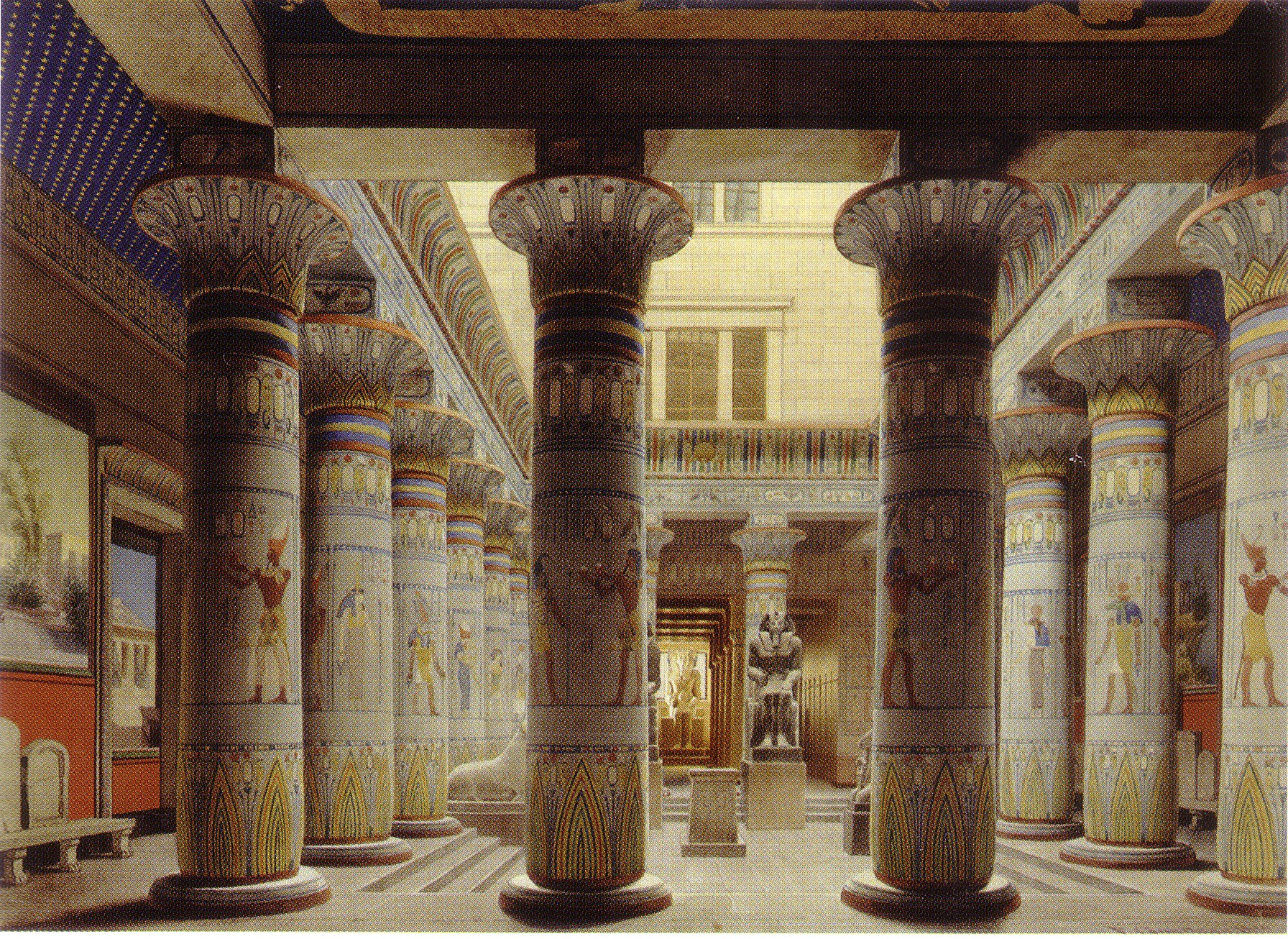 Von 1843 bis 1855 errichtet, war das Neue Museum im Stil der Zeit üppig mit Wand- und Deckenbildern dekoriert, die den Besuchern eine Vorstellung von den Monumenten der Pharaonen und aus anderen Epochen vermittelten. Den bunt ausgemalten Ägyptische Saal und andere Räume kann man nur noch auf historischen Zeichnungen sehen, hier geschaffen 1850 von Eduard Gaertner.