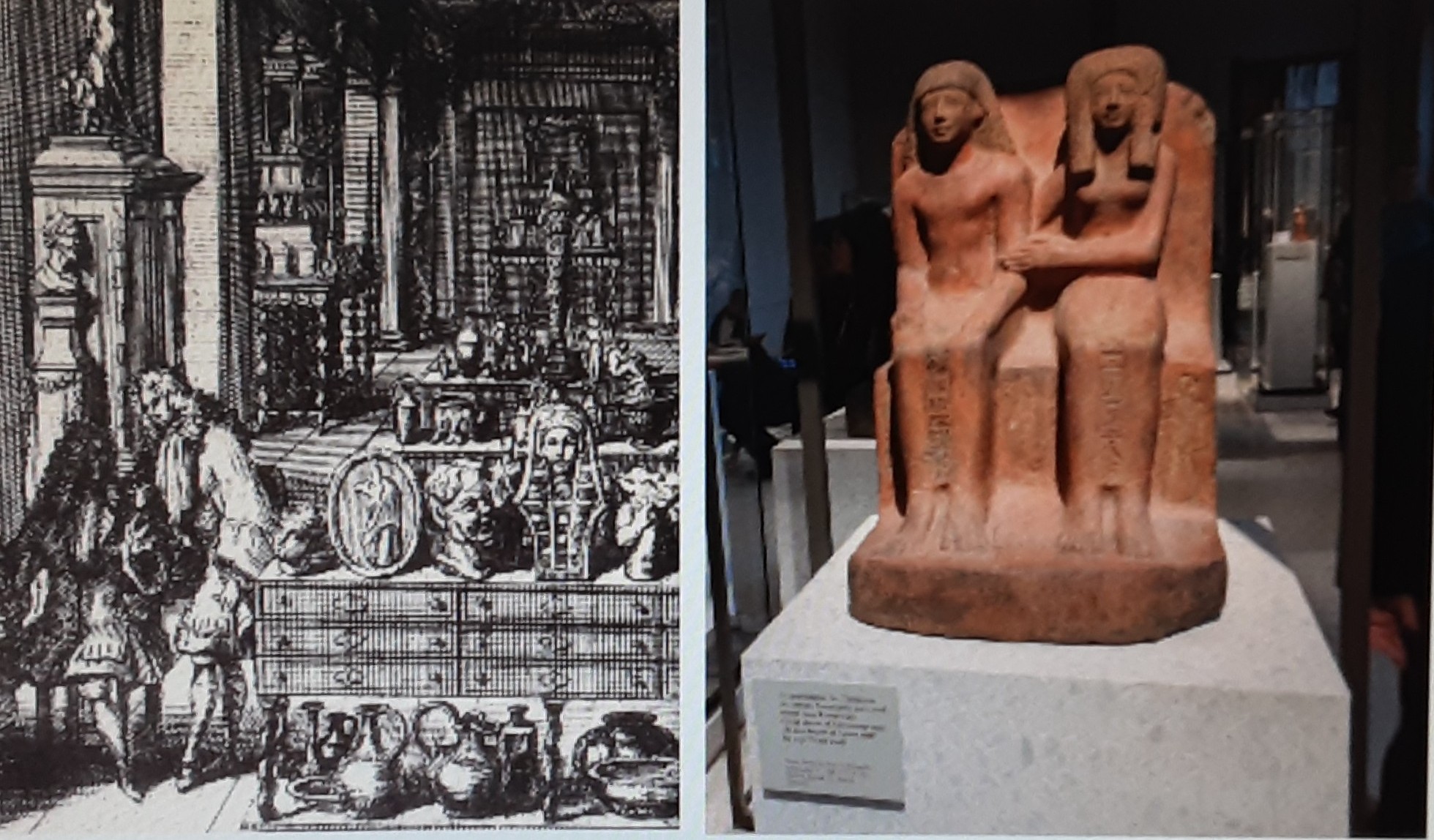 Ägyptische Altertümer hatten in fürstlichen Kunstkammern, den Keimzellen heutiger Museen, einen festen Platz. Der Berliner Kupferstich (Ausschnitt) von 1704 zeigt im Berliner Schloss aufgestellte Antiquitäten. Im Hintergrund erkennt man Schränke, in denen das königliche Münzkabinett aufbewahrt wurde. Kleine Figuren ließen sich einfach nach Berlin transportieren, der Aufwand bei gewaltigen Objekten war entschieden größer.