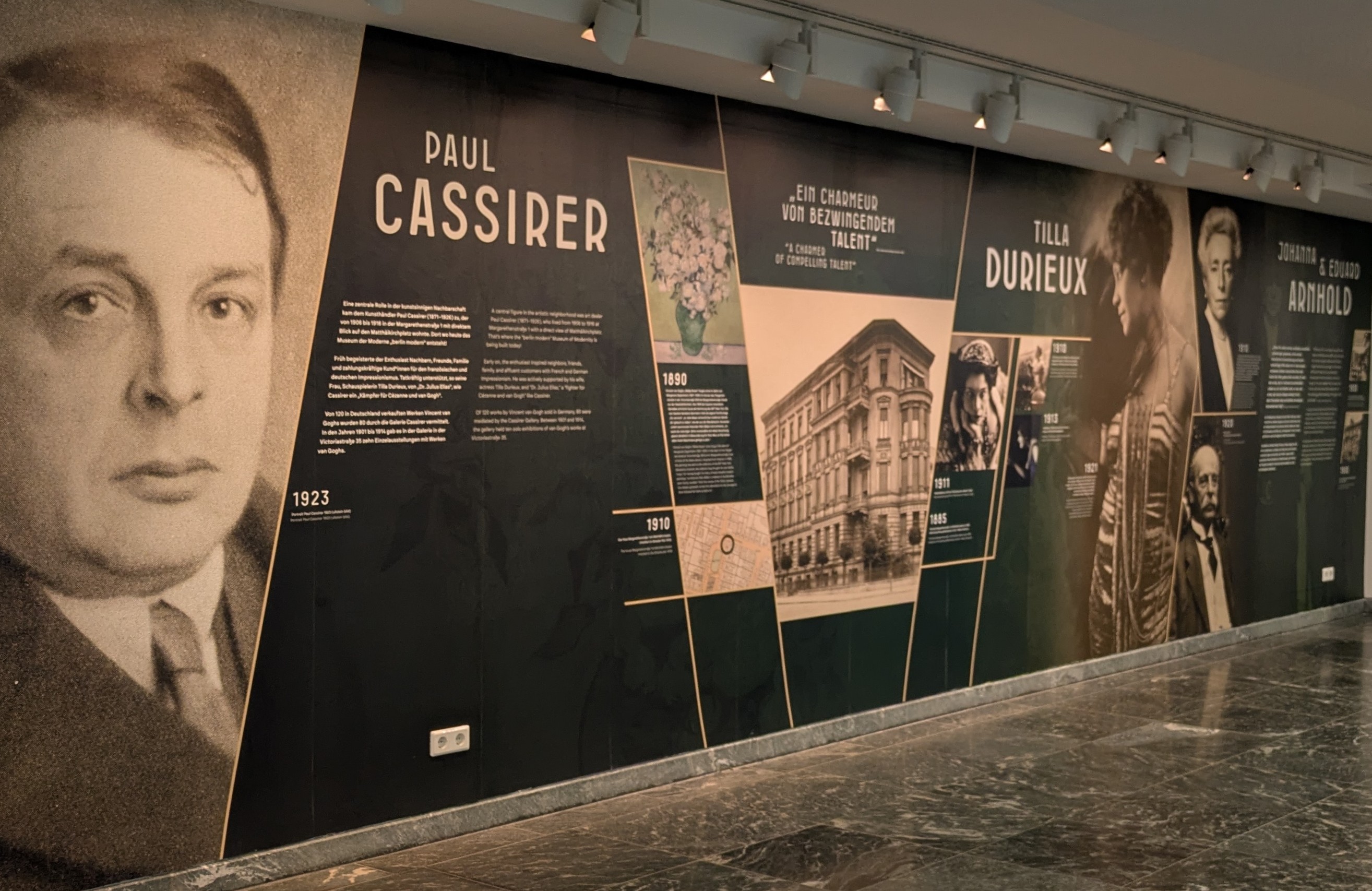 Von 120 in Deutschland verkauften Werken Vincent van Goghs hatte der Kunsthändler und Verleger Paul Cassirer 80 vermittelt. Zwischen 1901 und 1914 fanden in seiner Galerie in der Viktoriastraße 35 zehn Einzelausstellungen mit Werken dieses Künstlers statt. Cassirer schrieb 1925 über den Großkaufmann und Mäzen der Berliner Museen Eduard Arnhold, ohne ihn wäre seine Laufbahn unendlich schwieriger gewesen, ohne seine moralische Unterstützung und tatkräftige Hilfe wären ihm in den ersten schweren Zeiten seines Berufes vielleicht der Mut gebrochen worden. Das Ehepaar Eduard und Johanna Arnhold, James Simon, Markus Kappel, Oscar Huldschinsky und weitere Bewohner des Tiergartenviertels verwandelten ihre Wohnungen und Villen in Museen für Meisterwerke aus allen Epochen und förderten nach Kräften auch die Berliner Museen. An das großartige Mäzenatentum der Arnholds erinnert neuerdings eine Stele vor der Gemäldegalerie (siehe Eintrag auf dieser Internetseite vom 19. Oktober 2025). Paul Cassirer begeisterte Nachbarn, Freunde und zahlungskräftige Sammler für den in der Kaiserzeit als „Unkunst“ verteufelten französischen und deutschen Impressionismus und wurde dabei tatkräftig von seiner Frau, der Schauspielerin Tilla Durieux, unterstützt.