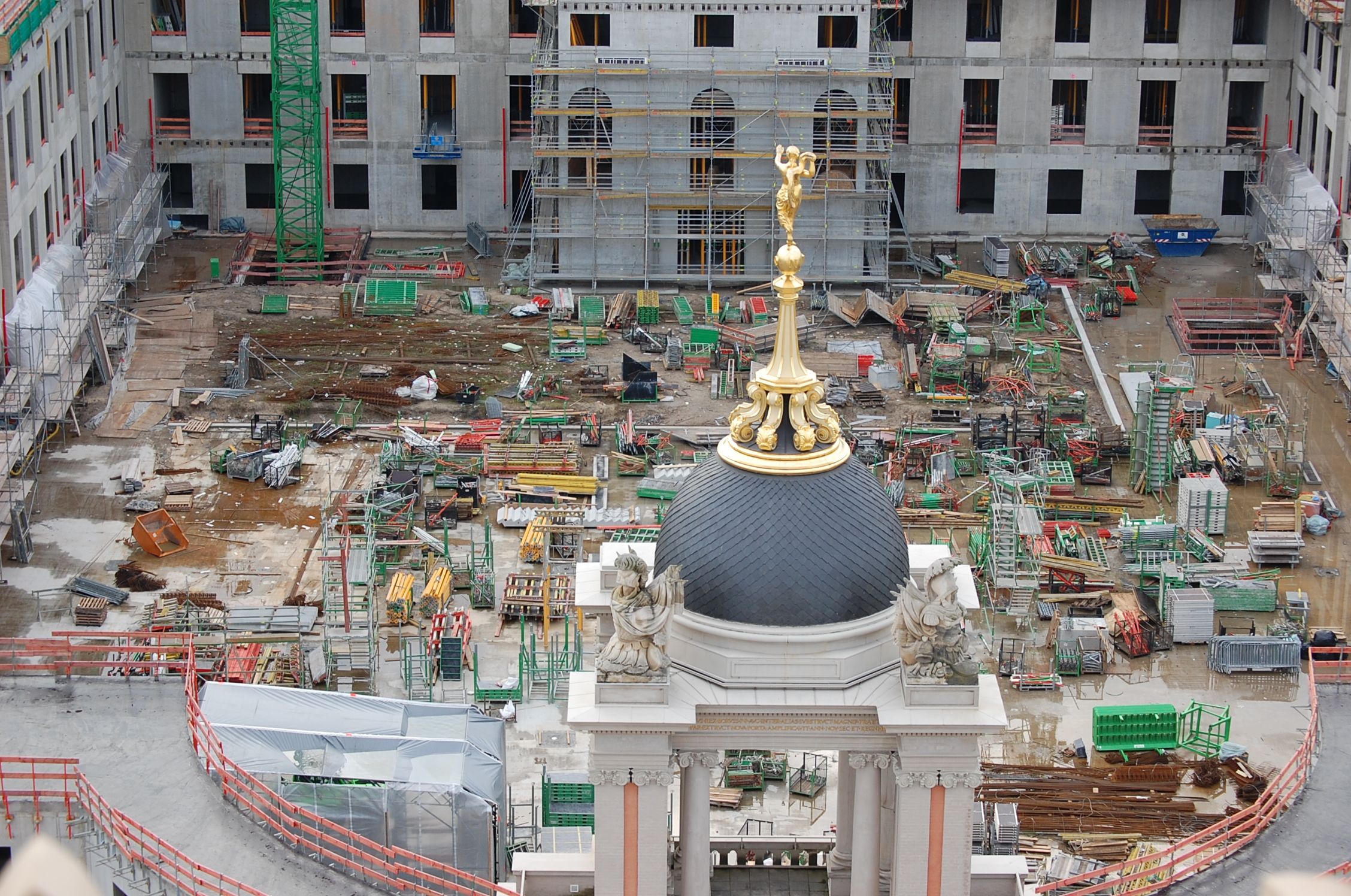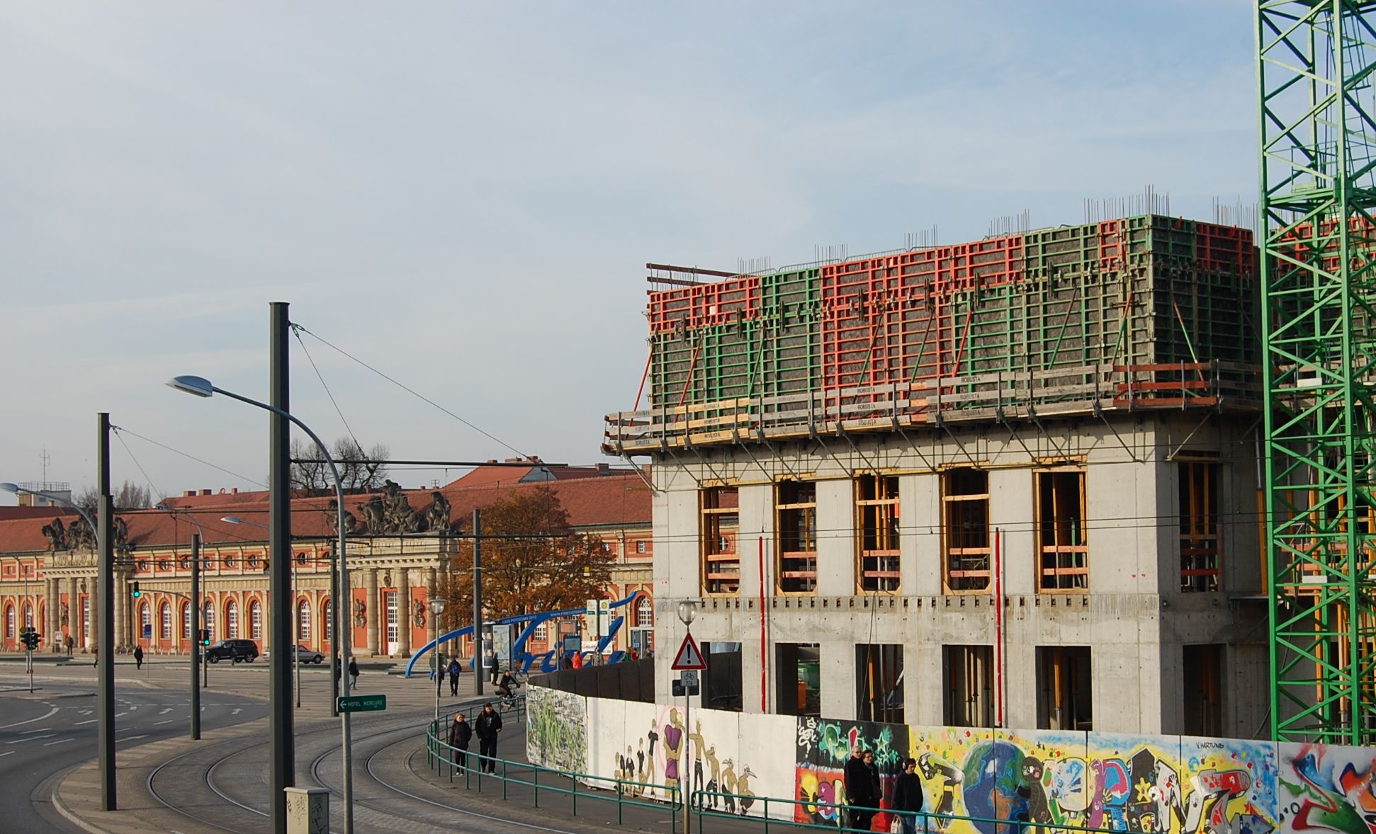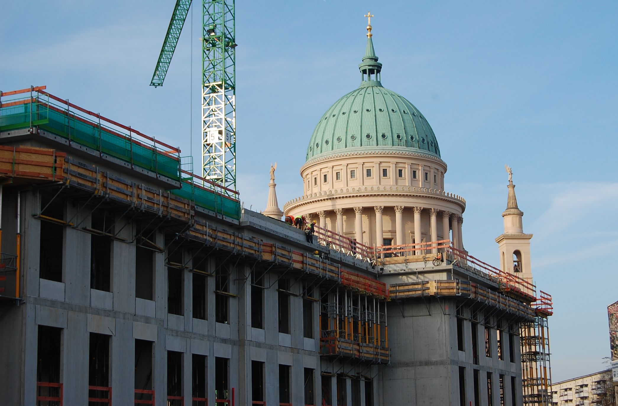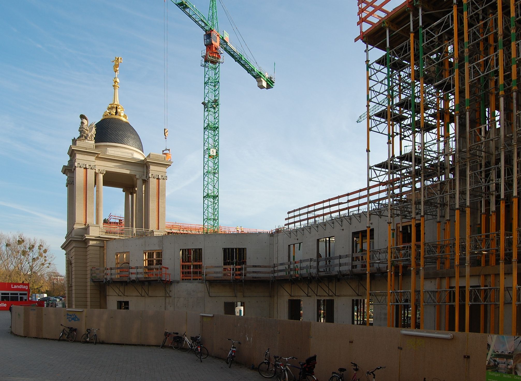 Gute Fortschritte macht der Wiederaufbau des Potsdamer Stadtschlosses als brandenburgischer Landtag. Die Dächer sind zum großen Teil bereits mit Kupferblech belegt, und auch der Säulenschmuck aus der Zeit Friedrichs II. ist schon zu erkennen. In nicht allzu langer Zeit gelangt man durch das Fortunaportal (rechts neben Obelisk) in den Hof des Barockbauwerks.