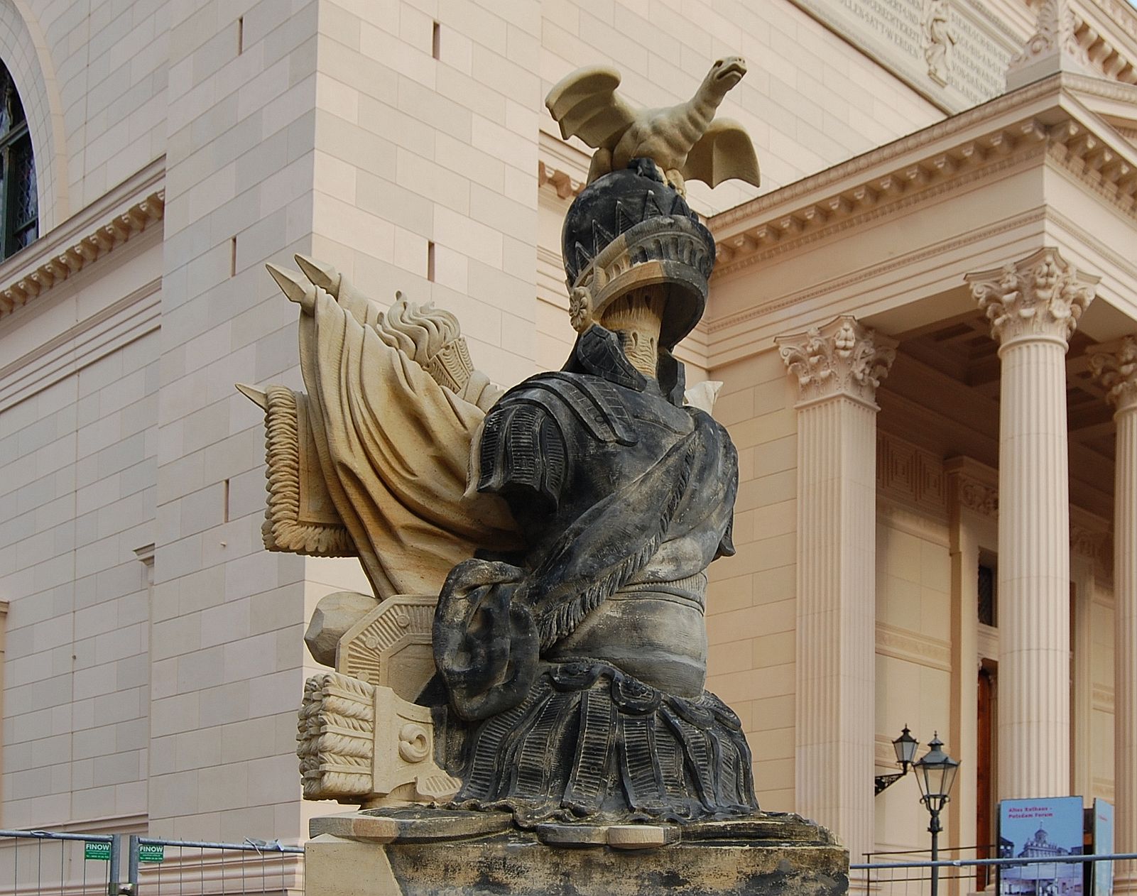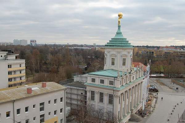 Blick von der Kuppel der Nikolaikirche auf das barocke Rathaus mit der vergoldeten Atlas-Figur auf der Turmspitze