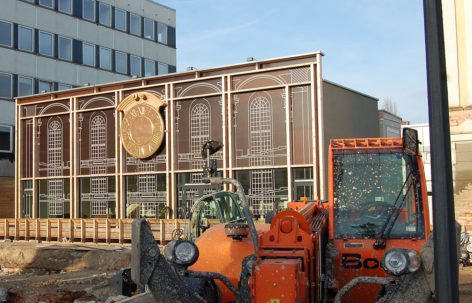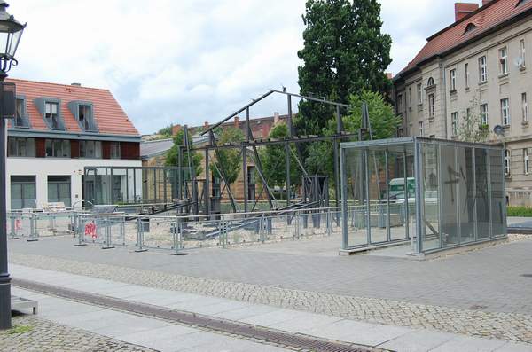 Am Standort der in DDR-Zeiten abgerissenen Garnisonkirche in der Breiten Straße signalisieren eine bemalte Plastikplane sowie Sandsteinfiguren, dass das Gotteshaus oder wenigstens sein hoher Turm in den nächsten Jahren wieder aufgebaut werden soll.