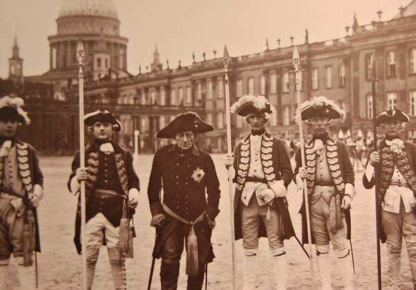 Otto Gebühr posiert mit Statisten vor dem Potsdamer Stadtschloss. Dieses wird derzeit als brandenburgischer Landtag aufgebaut, das Filmmuseum lädt im Marstall nebenan zum Besuch ein. Die Ausstellung ist Dienstag bis Sonntag von 10 bis 18 Uhr geöffnet. Der von Annette Dorgerloh und Marcus Becker herausgegebene Katalog mit 159 Seiten und zahlreichen Abbildungen kostet 16 Euro