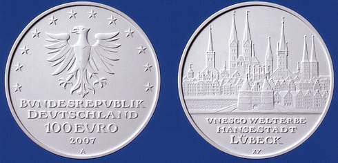 Im Rahmen ihrer Serie von Goldmünzen mit Bildern aus Altstädten, die wegen ihres besonders wertvollen Bestandes an historischen Bauwerken auf der UNESCO-Liste des Weltkulturerbes stehen, bringt die Bundesrepublik Deutschland 2007 ein Hundert-Euro-Stück mit Lübecker Gebäudeansichten heraus. Aus einem künstlerischen Wettbewerb ging der Berliner Münz- und Medaillendesigner Bodo Broschat als Sieger hervor. Ihm sei es in hervorragender Weise gelungen, auf der Bildseite das Thema UNESCO-Welterbe-Hansestadt Lübeck in seiner Ganzheit gestalterisch umzusetzen, stellte die Jury fest. „Die Darstellung zeigt sowohl die Stadtsilhouette mit den charakteristischen sieben Türmen als auch die feingliedrige städtebauliche Struktur der Bürgerhäuser“. Das sonst solitär, also vereinzelt stehend, bekannte Holstentor sei gut in das Gesamtensemble eingebunden. In der Bildkomposition sei das Verhältnis von Stadtdarstellung und Schrift mit seiner klaren Trennung ausgewogen, und auf der Wertseite sei der Adler beeindruckend herausgearbeitet. Über die klare und eindeutige Positionierung der Schrift entstehe eine sehr gute Korrespondenz zwischen Bild- und Wertseite.