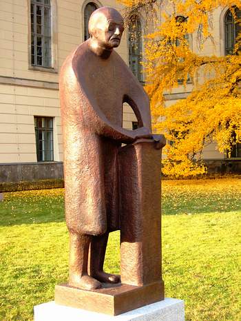 Berlin besitzt ein neues Denkmal, das es schon seit über einem halben Jahrhundert gibt. Die auf einem niedrigen Sockel seit kurzem stehende Bronzeplastik im Ehrenhof der Humboldt-Universität ehrt den berühmten Physiker Max Planck (1858-1947). Mit den Marmorfiguren des Althistorikers Theodor Mommsen und des Physikers Hermann von Helmholtz sowie der Brüder Wilhelm und Alexander von Humboldt, die direkt an der Straße Unter den Linden Platz genommen haben, bildet die Figur eine wunderbare Einheit. Sie zeigt, dass Gelehrtendenkmäler auch mit sehr sparsamen Mitteln sehr eindrucksvoll sein können.